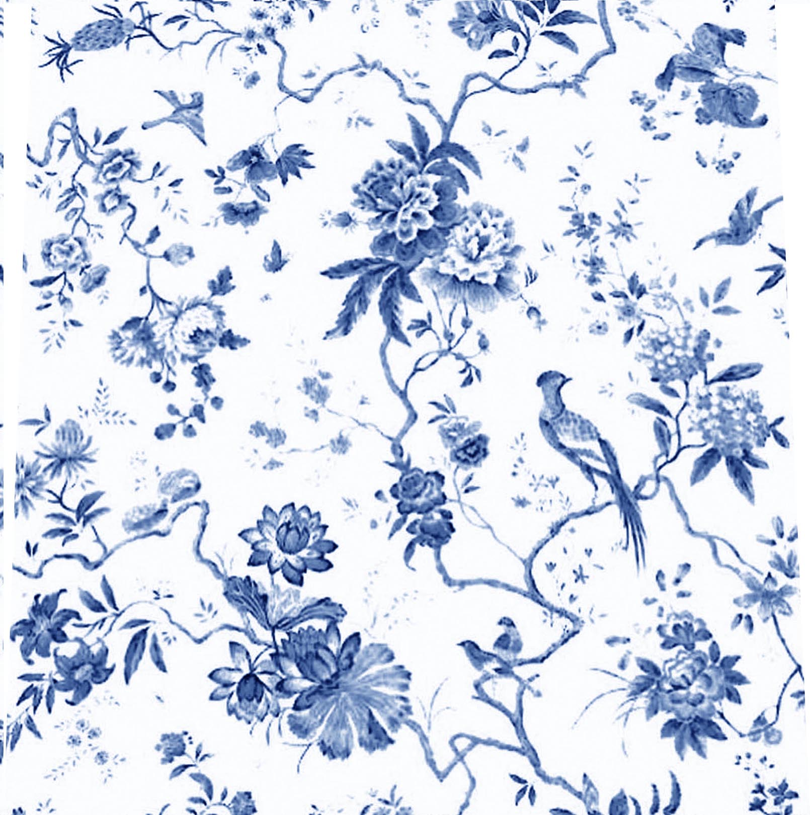 Description: A blue and white floral pattern with birds and flowers on it's side.