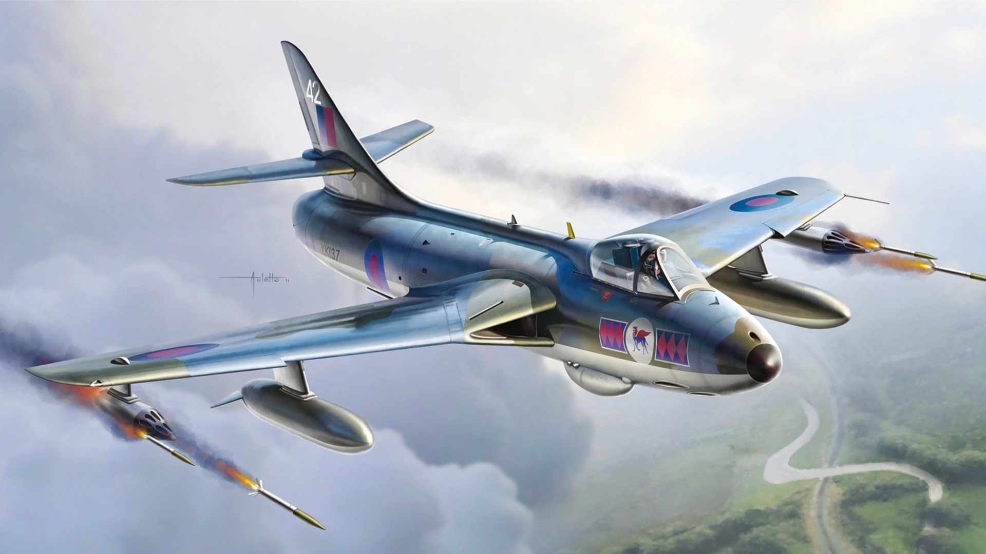 Description: A blue and white jet flying through a cloudy sky with two jets in the sky above it and a road running through the sky.