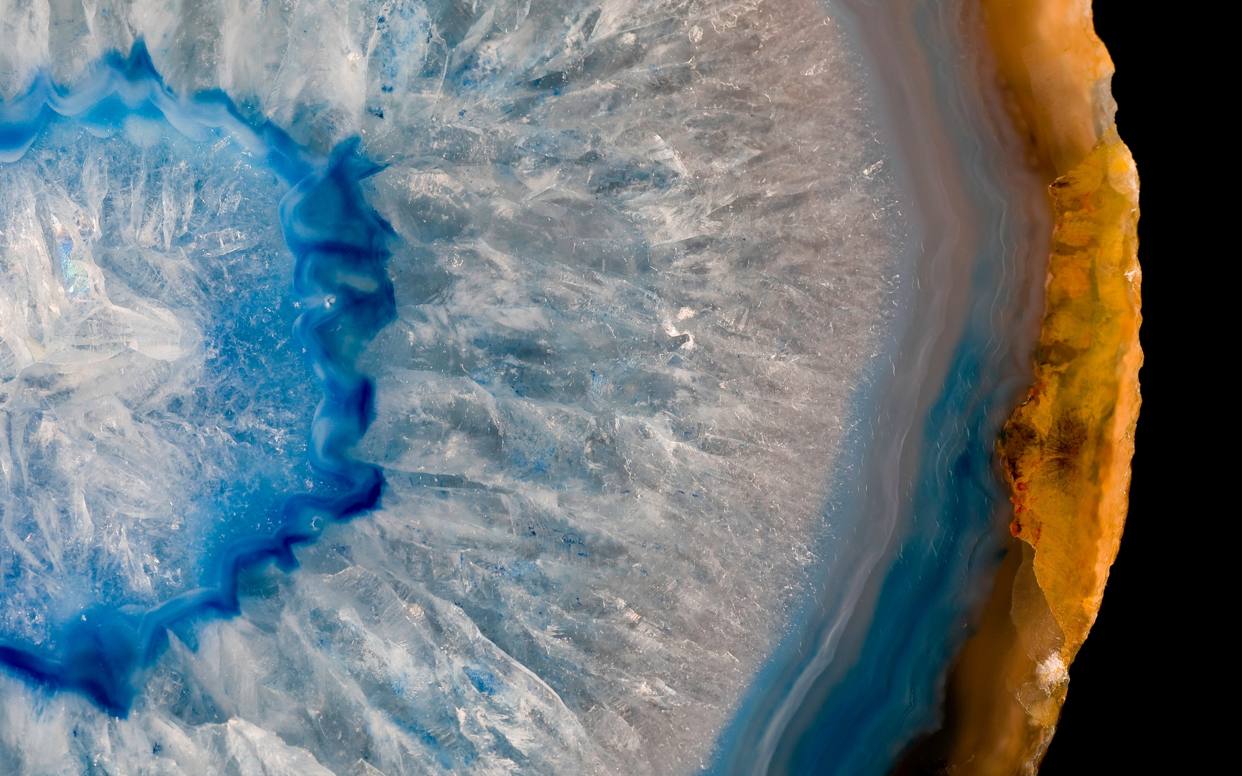 Description: A close up of a blue and white object with a black background and a yellow edge and a blue circle.