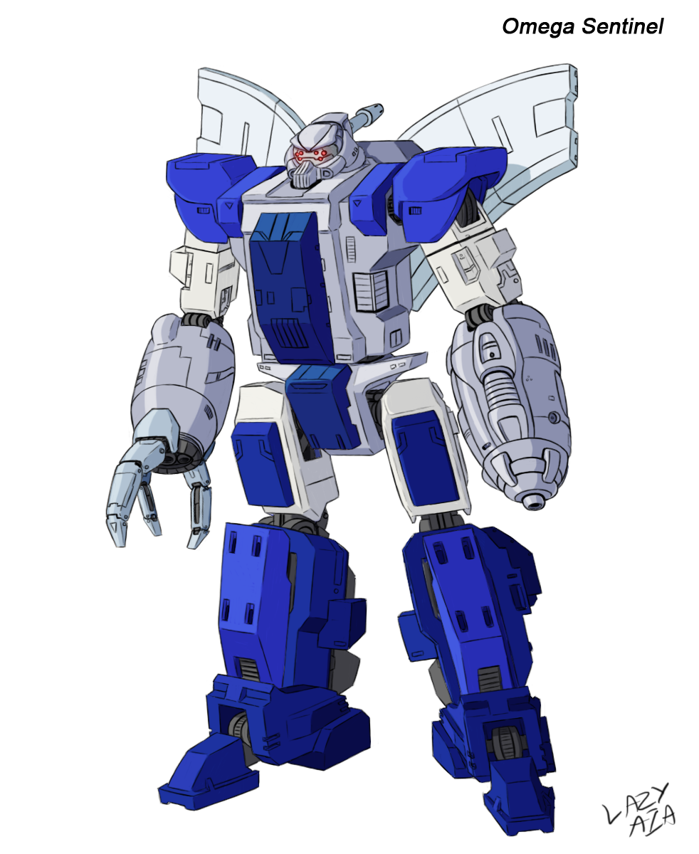 Description: A blue and white robot with a large wing on it's back legs and arms.