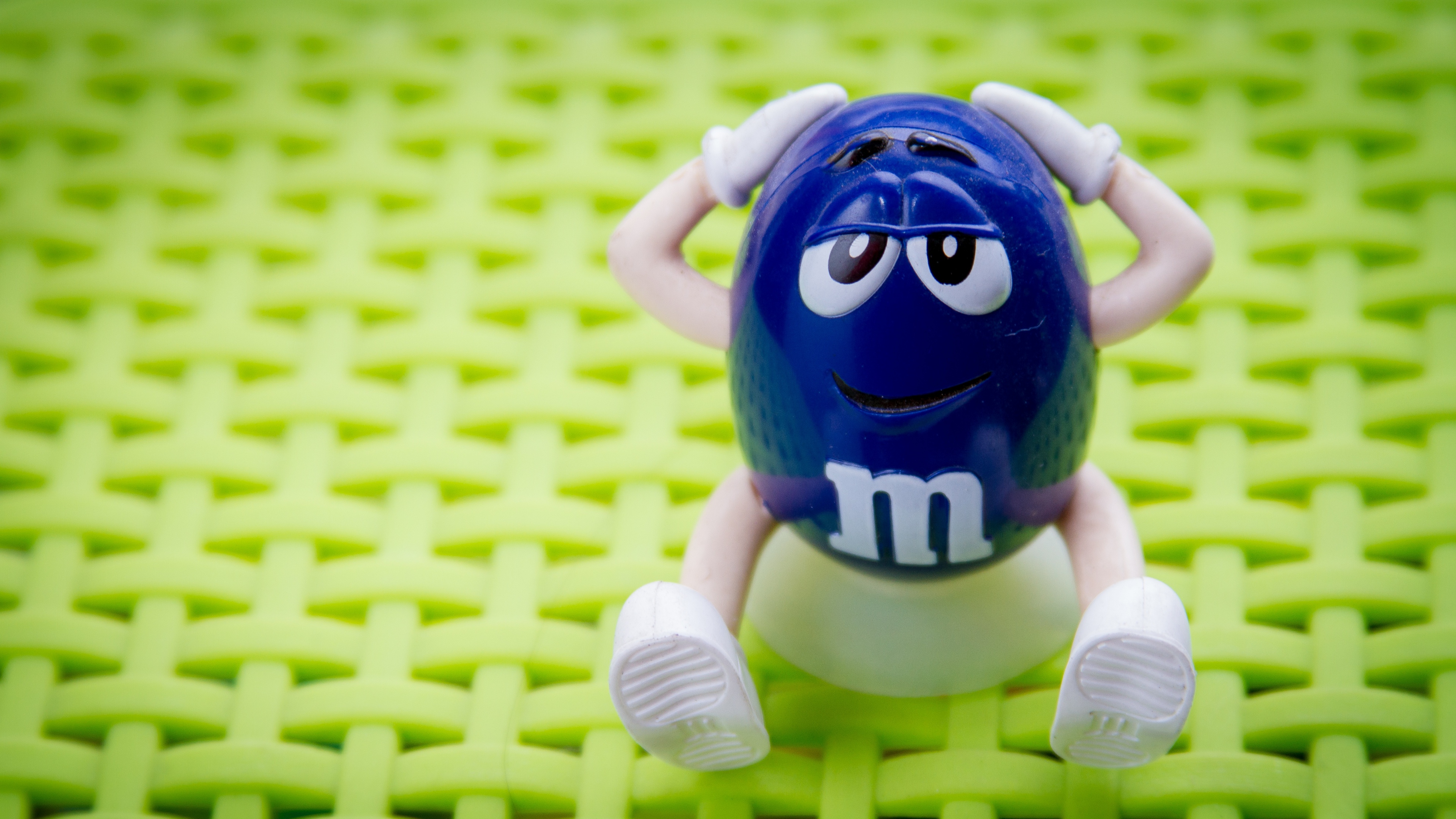 Description: A blue and white toy sitting on a green mat with a smile on it's face and hands.