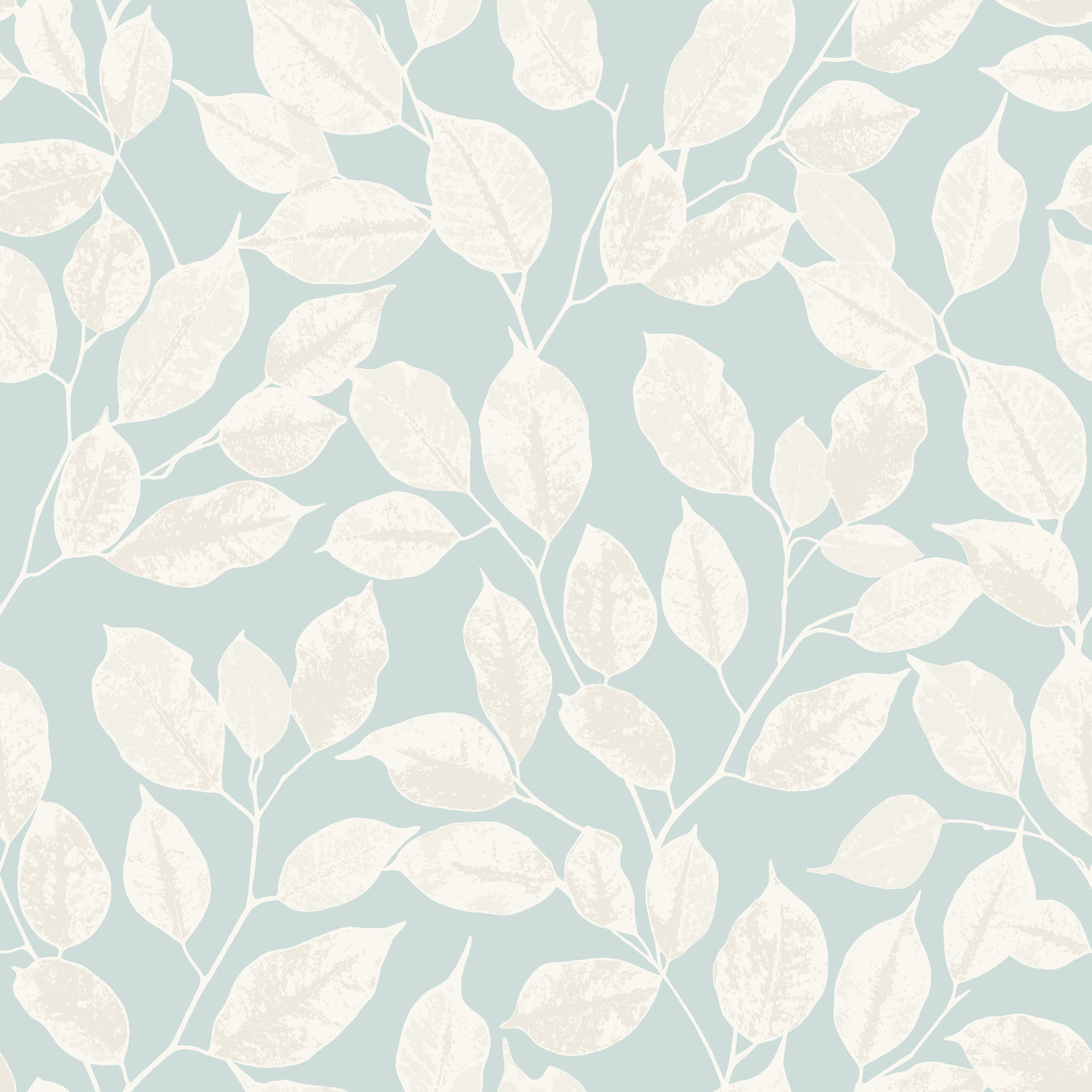 Description: A blue and white wallpaper with leaves on it's sides and a light blue background with a white outline.