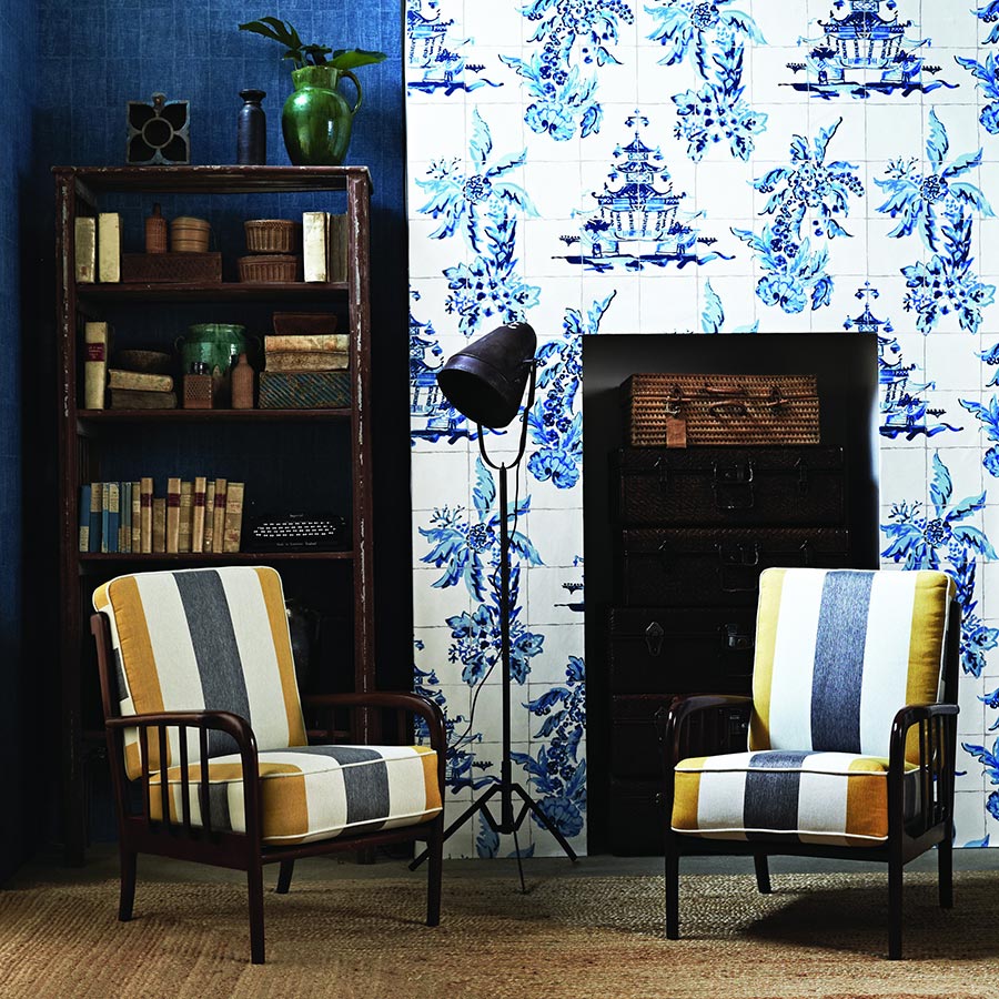 Description: A room with a blue and white wallpaper and two chairs and a book shelf with a lamp on it.