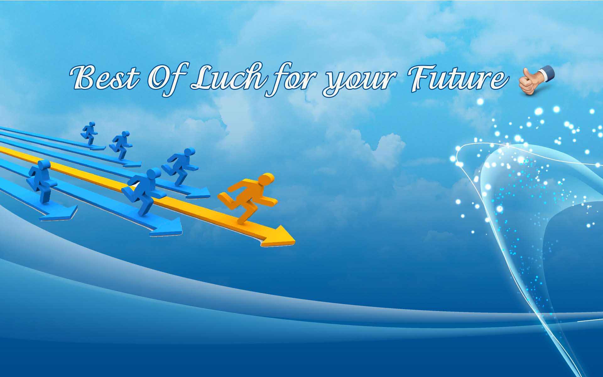 Description: A blue and yellow banner with arrows pointing in different directions and the words best of luck for your future.