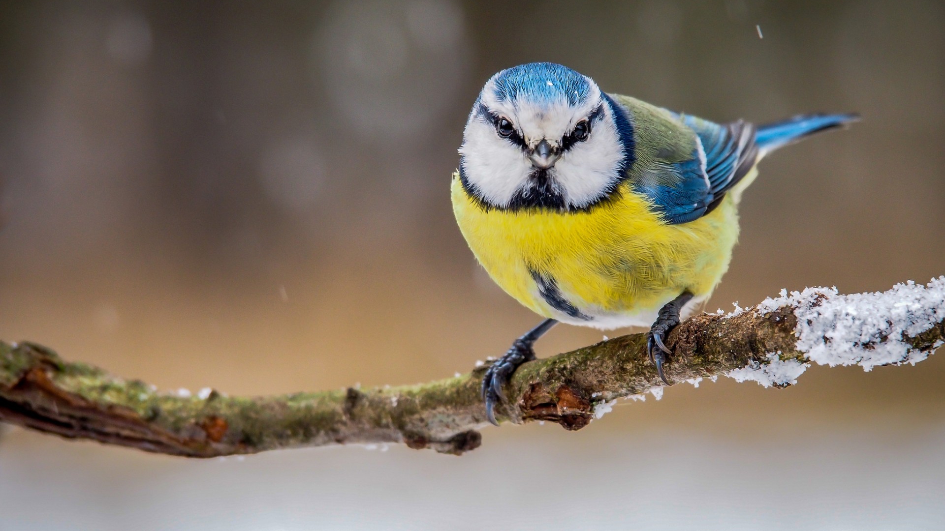 Description: A blue and yellow bird sitting on a branch in the snow with snow flakes on it's back.