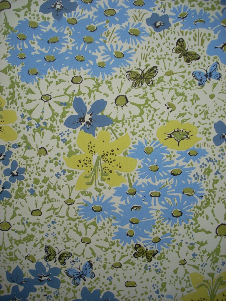 Description: A blue and yellow flowered wallpaper with butterflies and flowers on it's side and a butterfly on the wall.