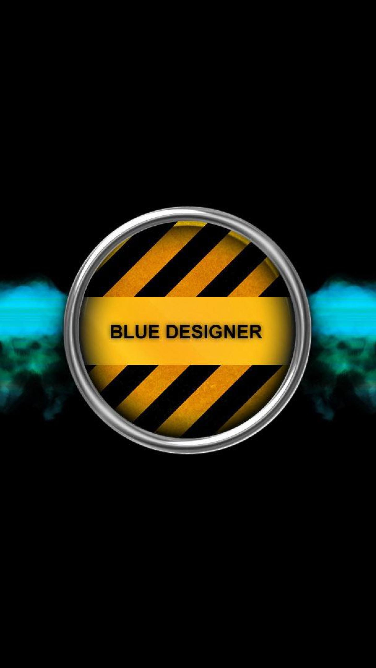 Description: A blue and yellow sign that says blue designer on it's side and a black background with a blue light behind it.