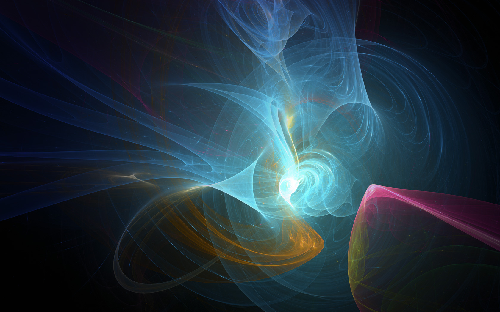 Description: A computer generated image of a blue and yellow swirl with a black background and a white center in the center.