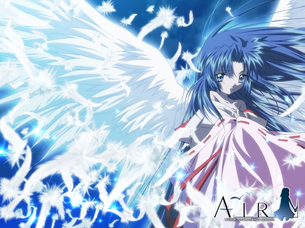 Description: A girl with blue hair and angel wings in a blue sky with white stars and snow flakes around her.