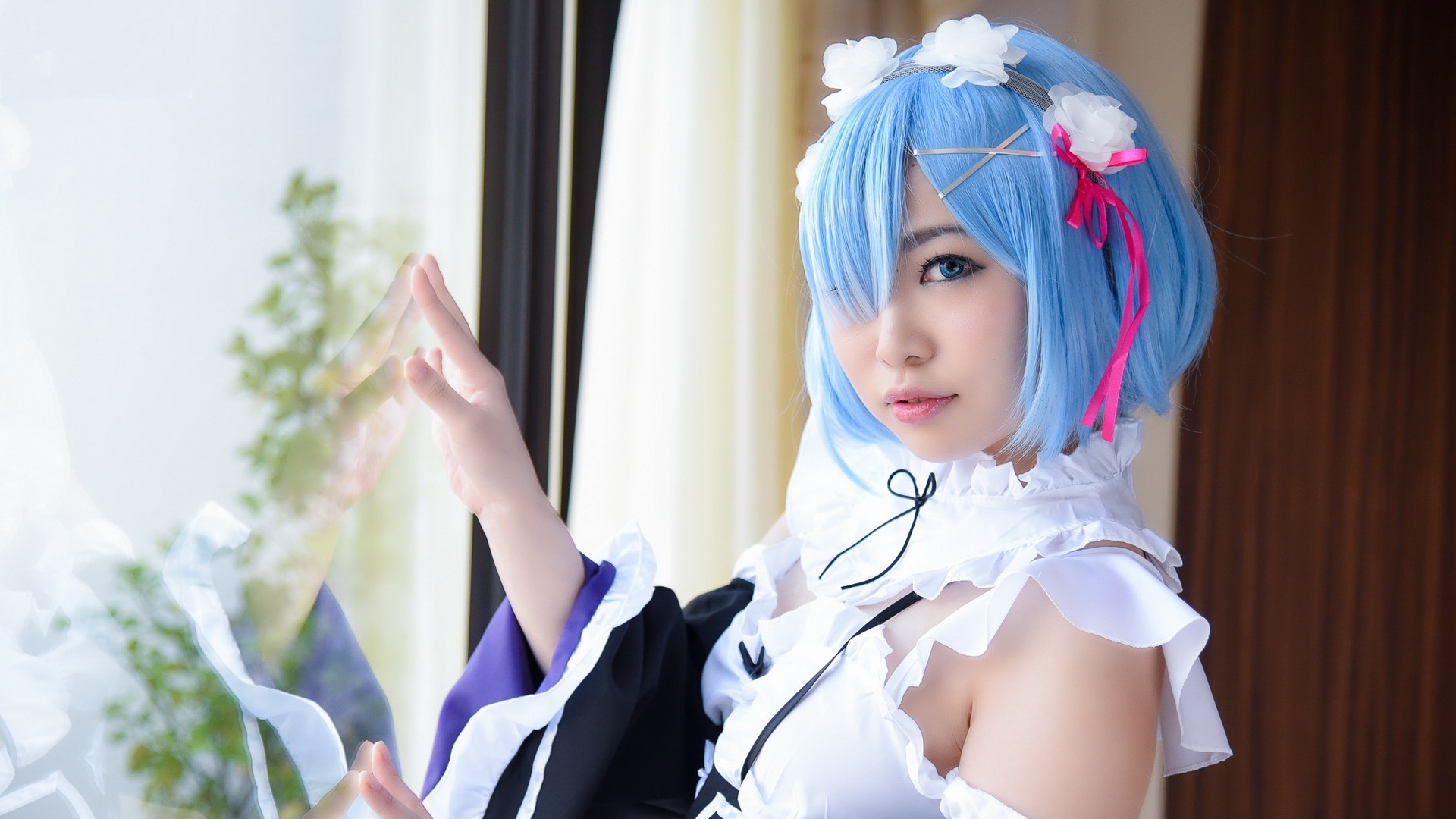 Description: A woman with blue hair and a white dress is posing for a picture with her hand up in the air.