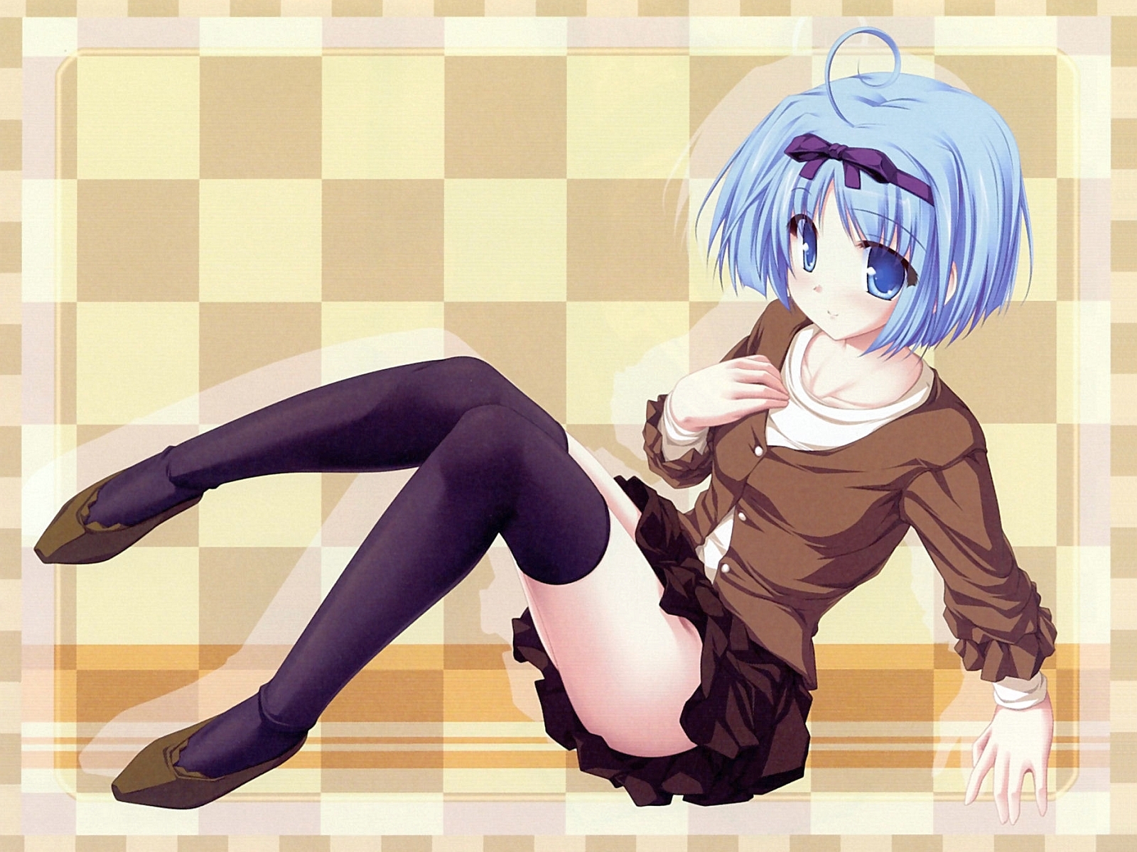Description: A woman with blue hair and black stockings sitting on a checkered wallpapered floor with her legs crossed.