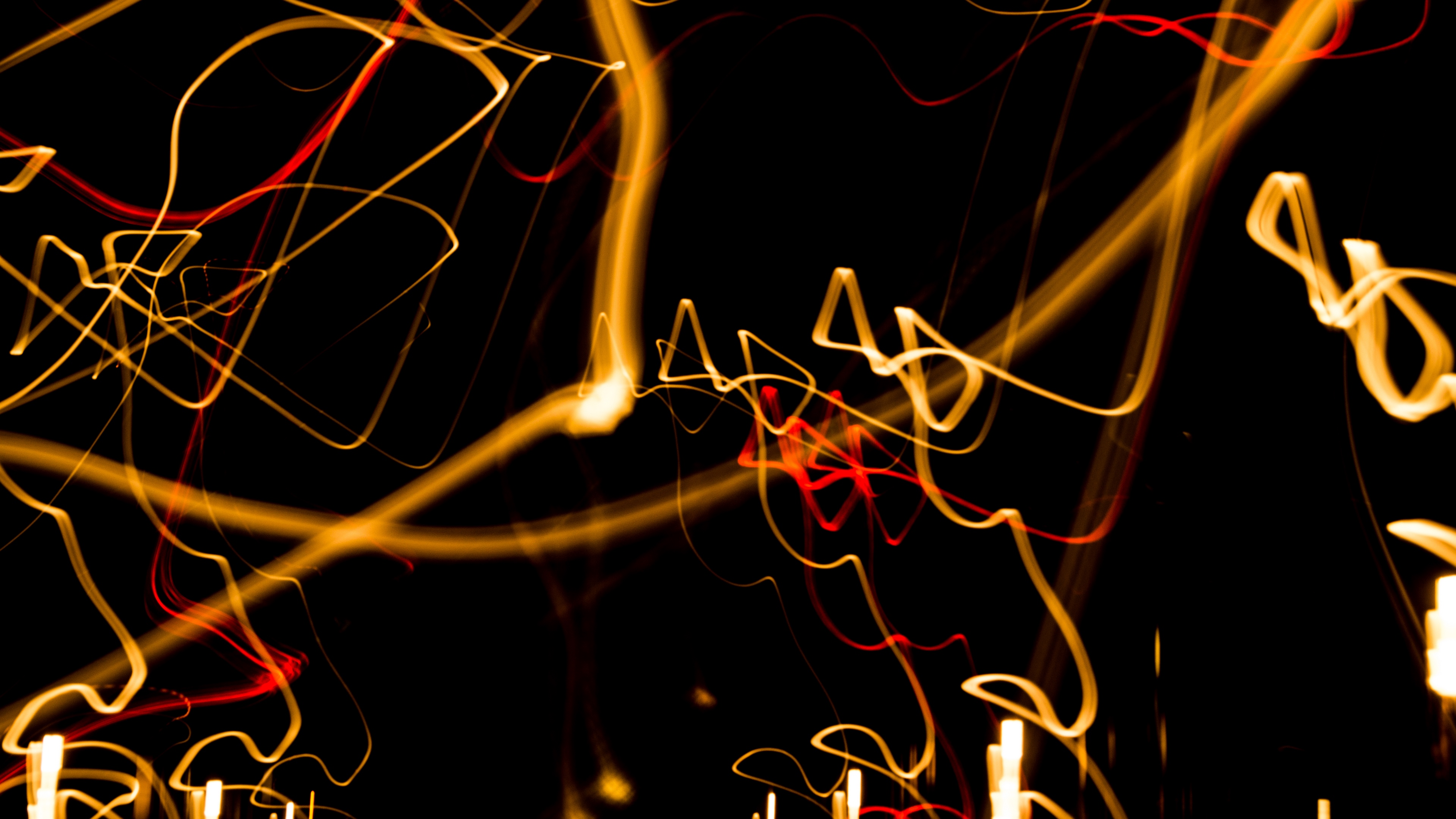 Description: A blurry photo of a black background with red and yellow lights in the middle of it and a black background with white letters.