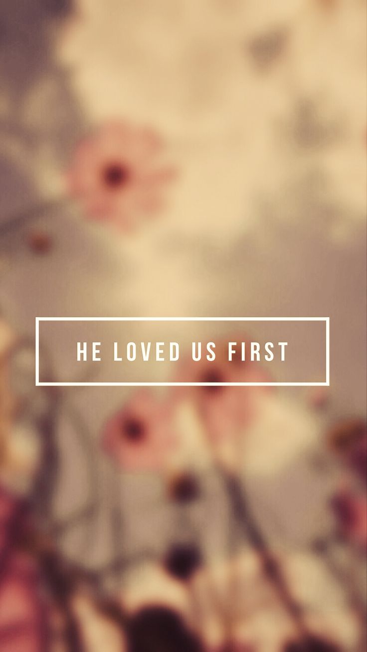 Description: A blurry photo of flowers with the words he loved us first on it's side of the picture.