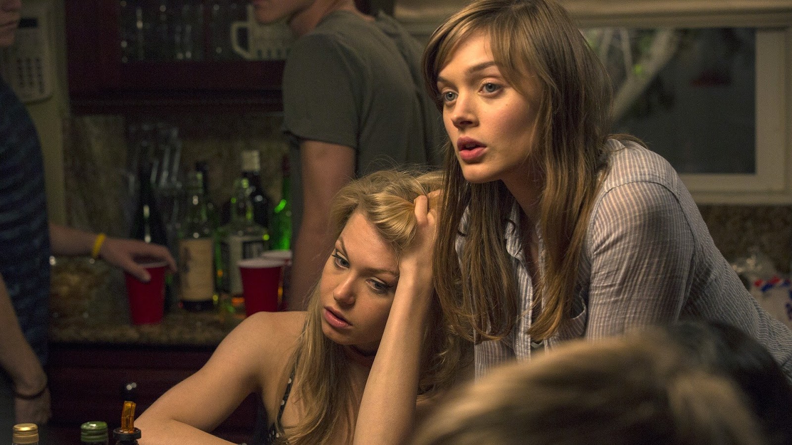 Description: A woman sitting at a table with a man standing behind her and a woman standing behind her with her hand on her head.