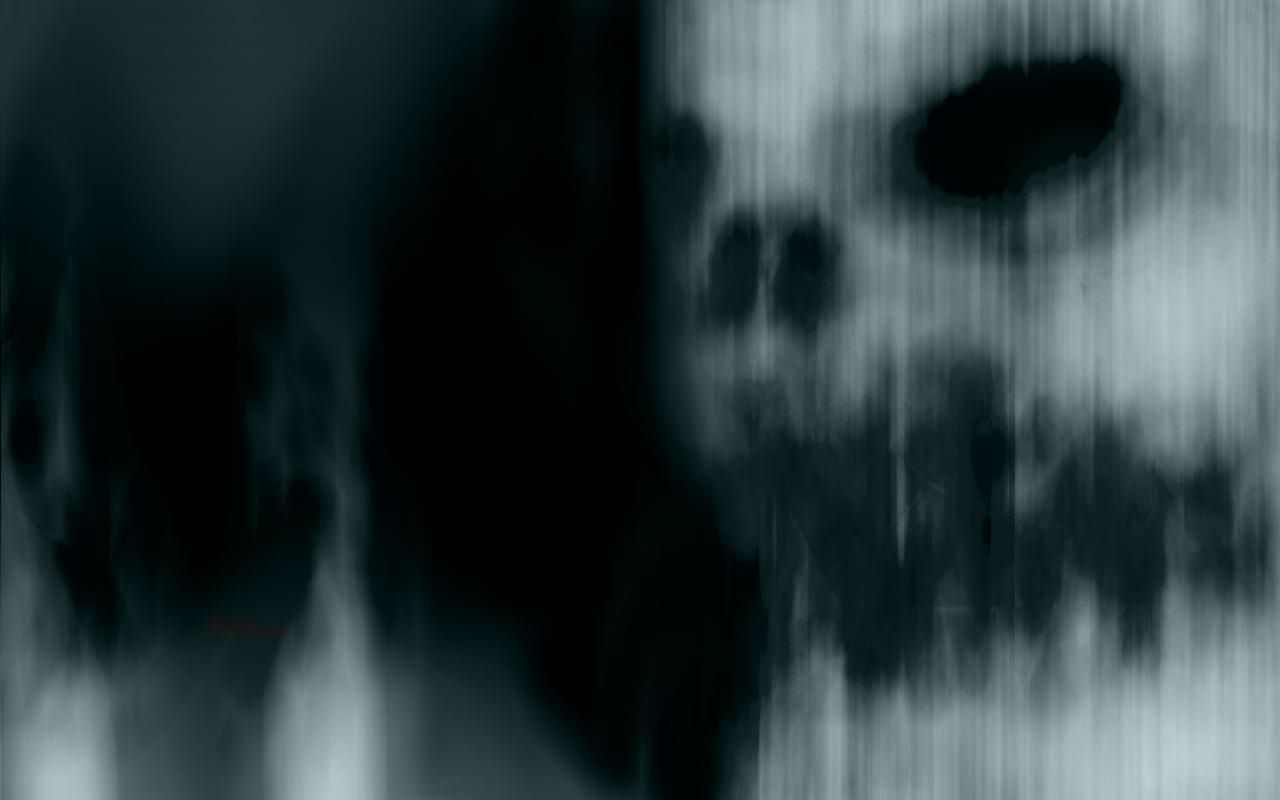 Description: A blurry image of a skull with a cross on it's face and a red light in the background.