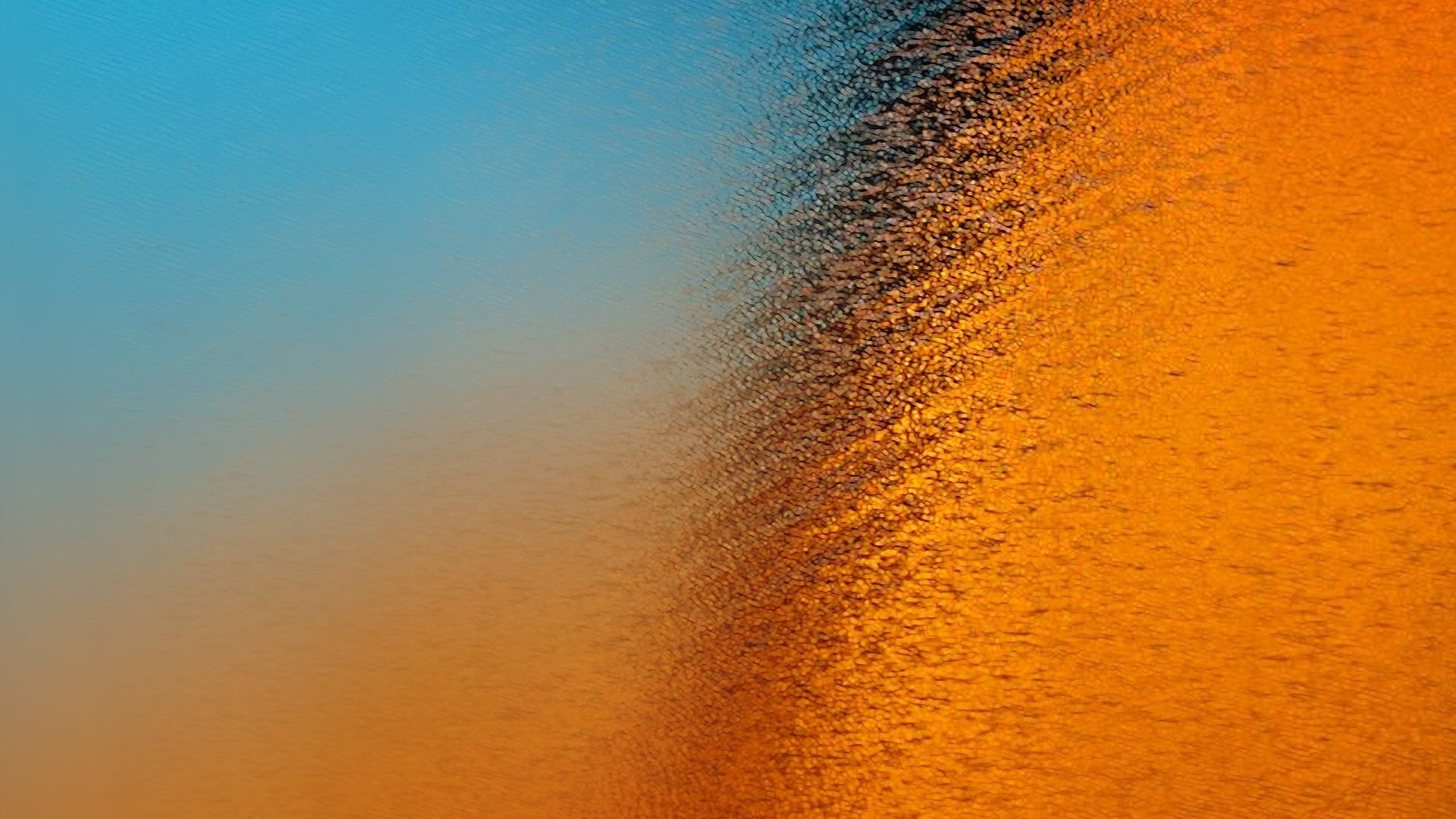 Description: A blurry image of a blue sky and orange sand on the beach with a small boat in the water.