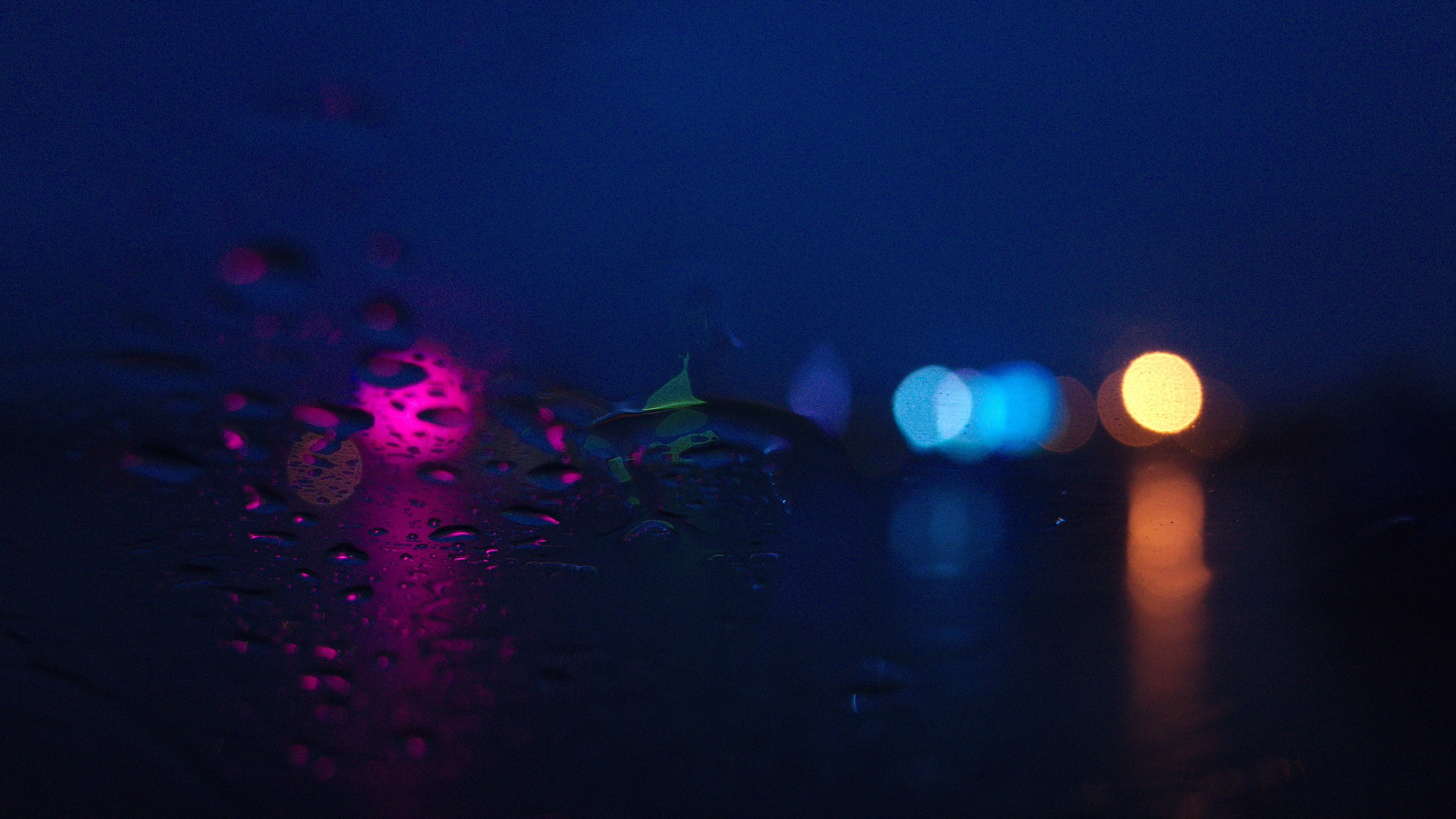 Description: A blurry photo of a street light and rain drops on a window glass at night time with a blurry background.