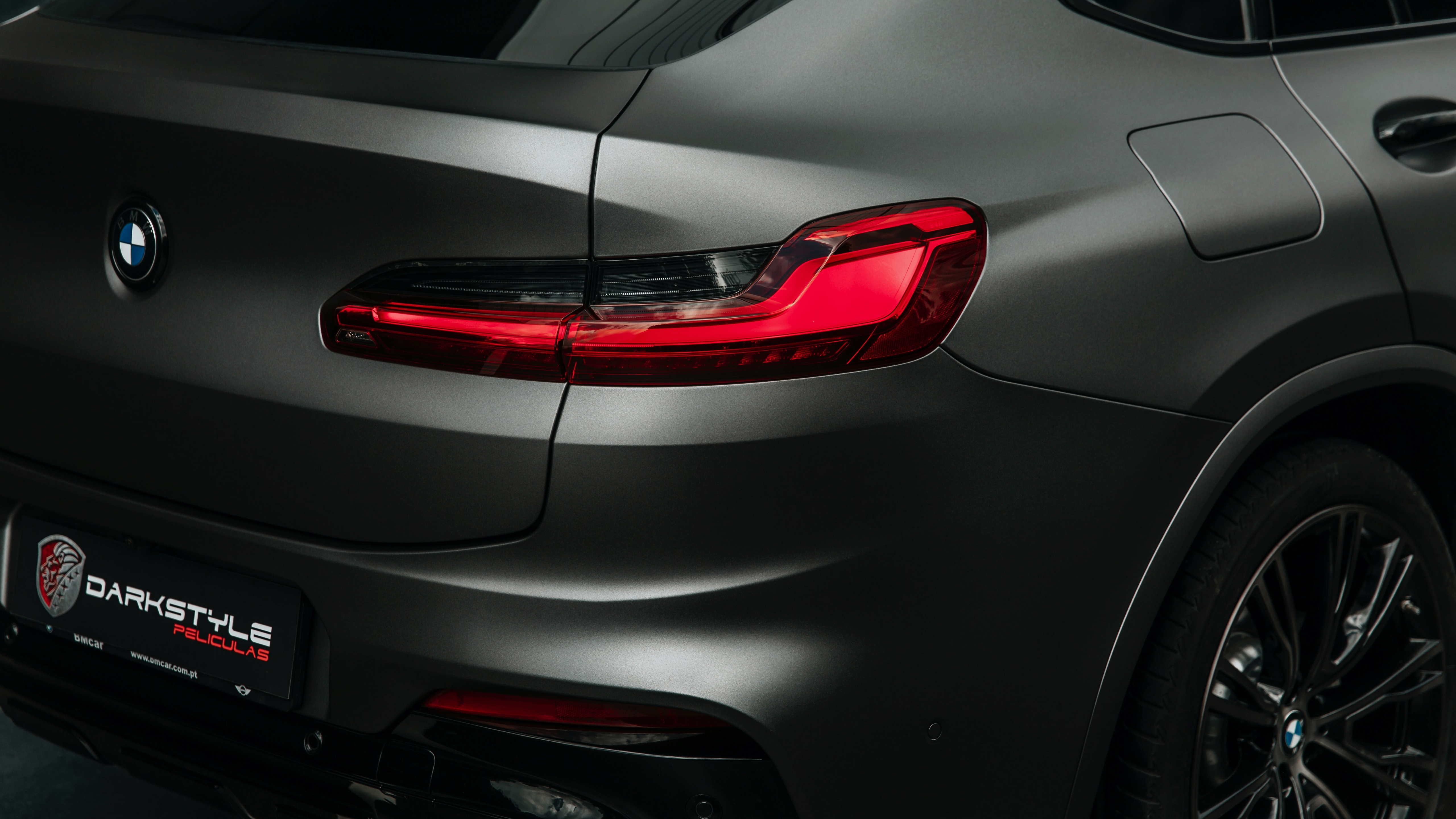Description: A close up of a bmw car with a red light on it's tail light and a black background.