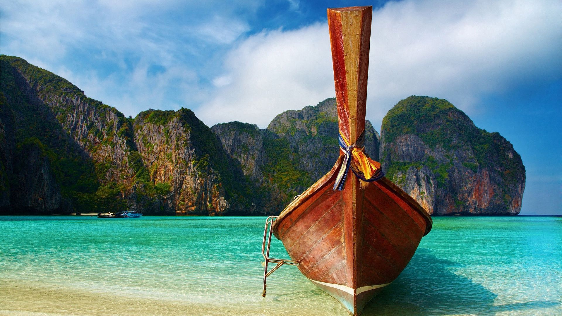 Description: A boat sitting on top of a sandy beach next to a mountain range in the ocean with a boat tied to it.