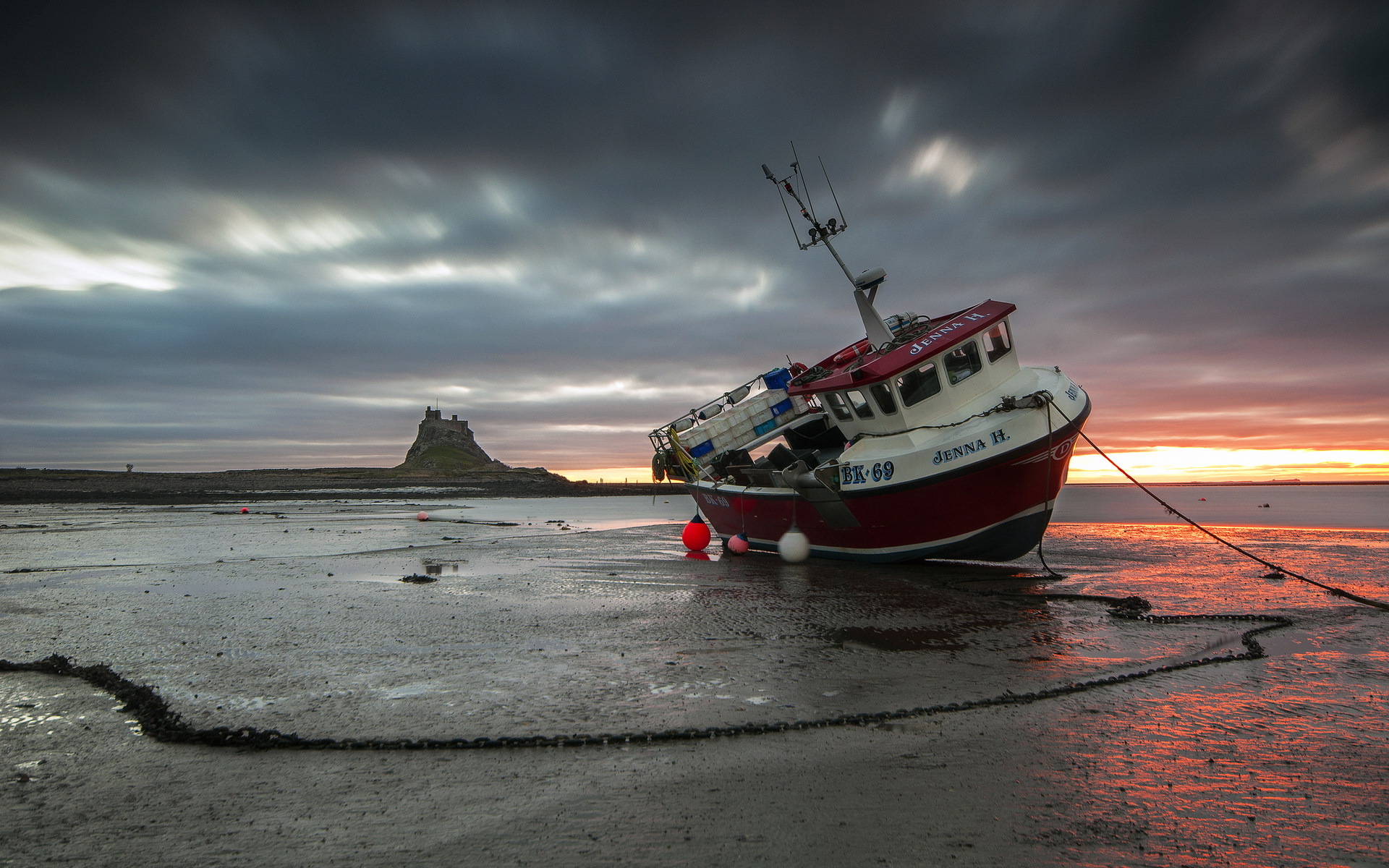 Description: A boat is sitting on the beach at sunset or dawn with a rope in the foreground and a rock outcropping in the background.