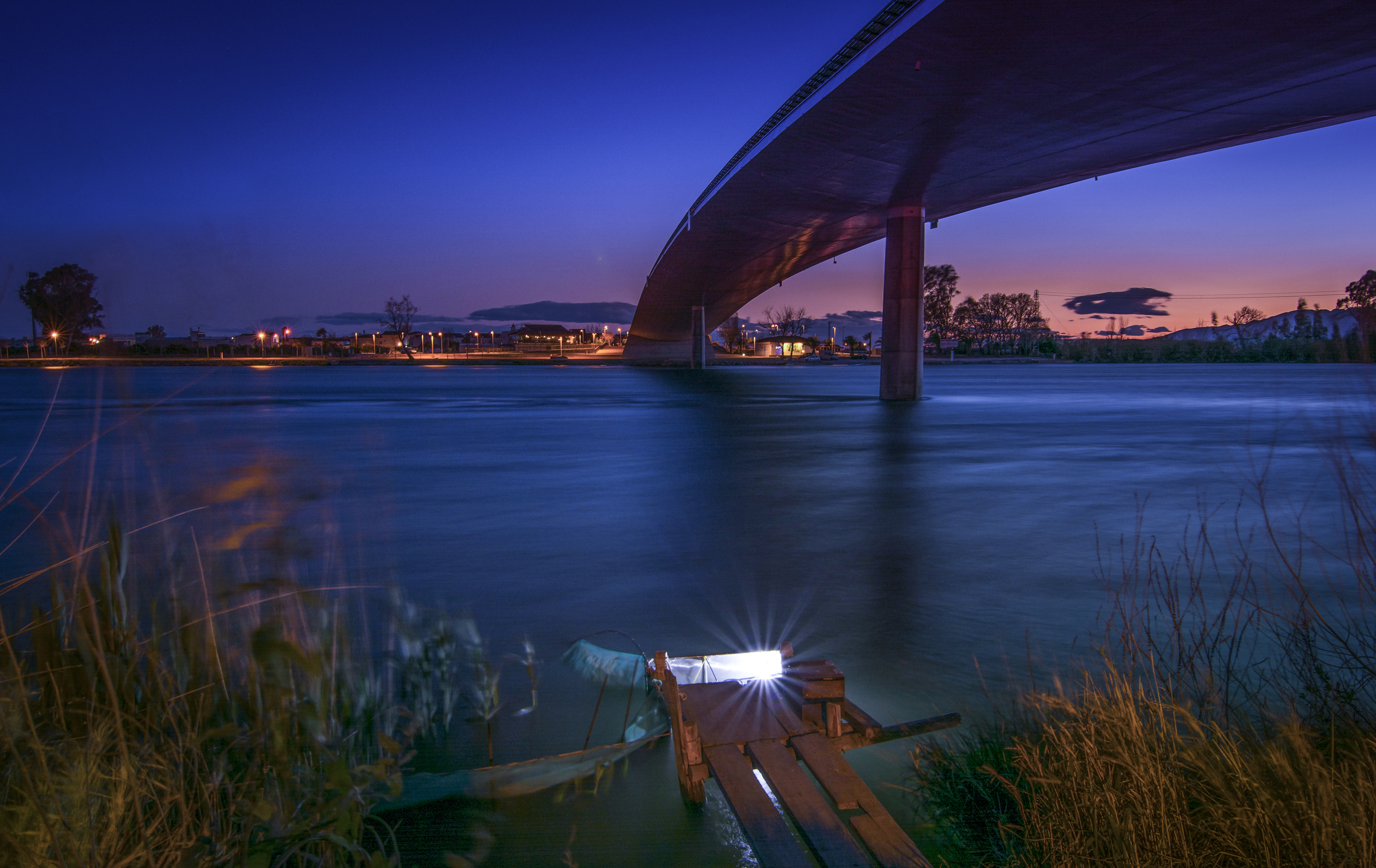 Description: A boat is docked under a bridge at night time.