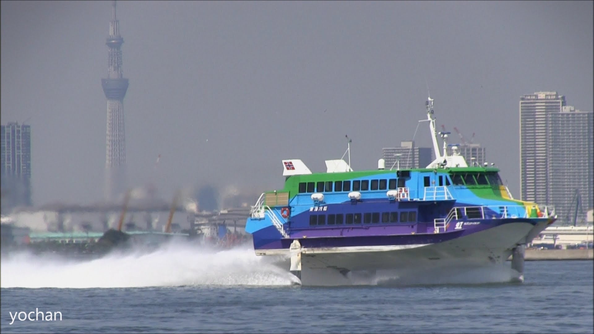 Description: A boat is traveling in the water near a city skyline with a tower in the background and a boat in the foreground.