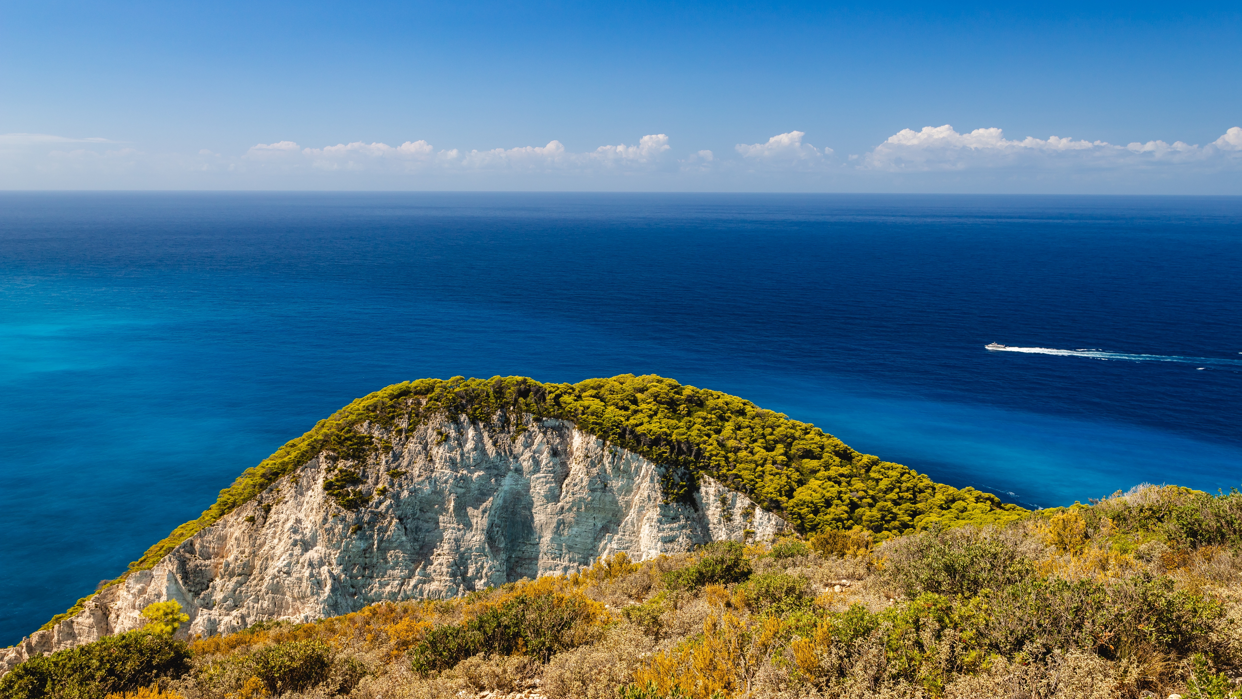 Description: A boat is in the water near a cliff and a beach with a boat in the distance and a boat in the water.