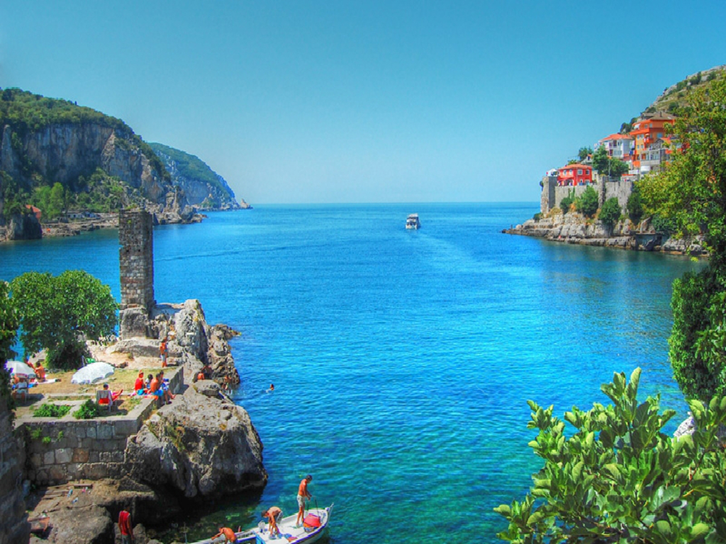 Description: A boat is in the water near a cliff side town and a beach with people on it and a boat in the water.