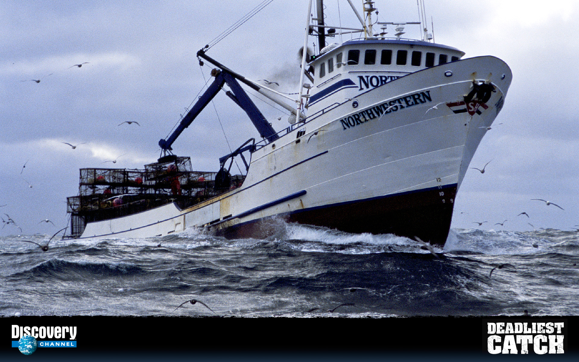 Description: A boat in the ocean with a crane on it's back end and birds flying around it and a cloudy sky.