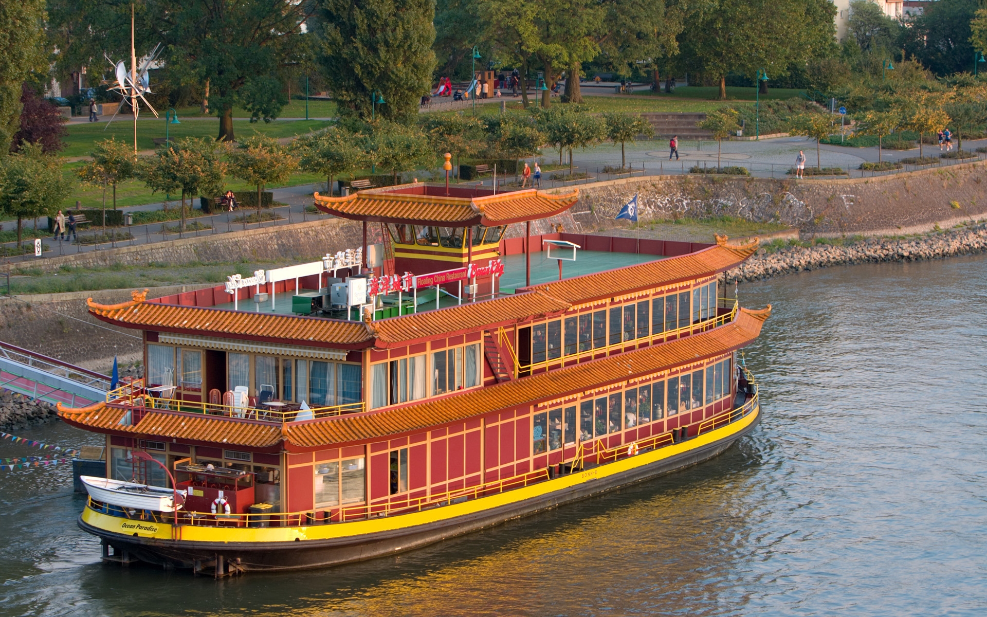 Description: A boat with a yellow and red roof is on the water near a dock and a sidewalk with people walking on it.
