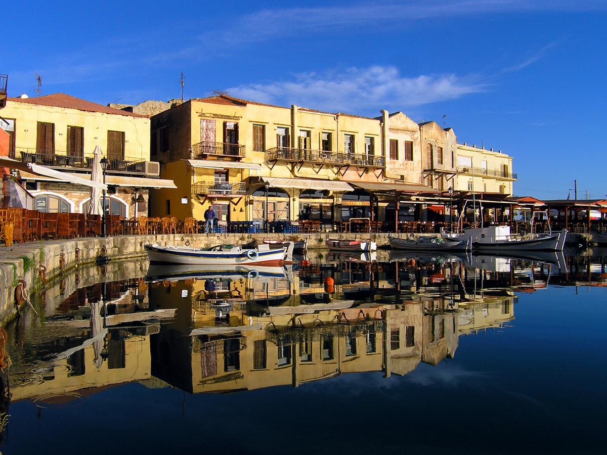 Description: A boat is docked in a harbor near buildings and a bridge with a few people on it and a few boats in the water.