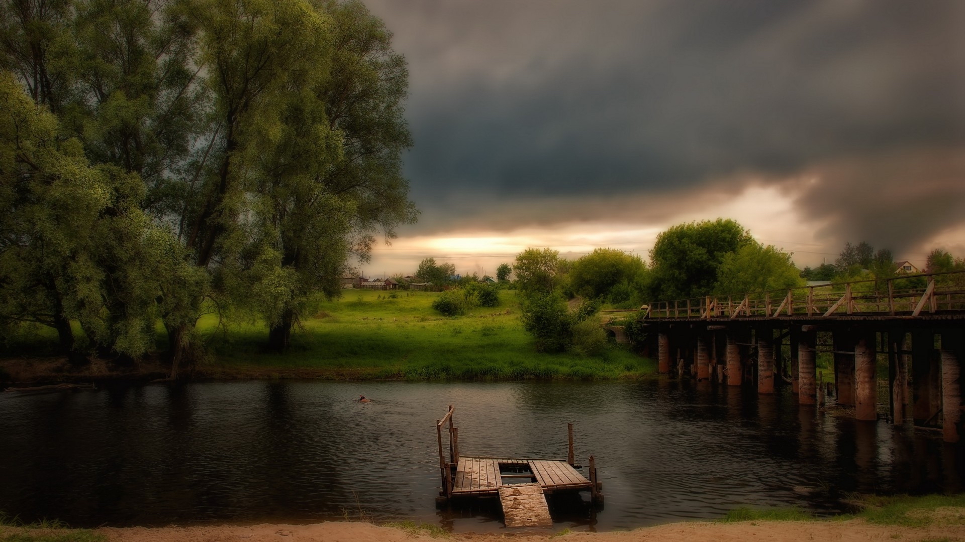 Description: A boat is docked on a river under a cloudy sky with a bridge in the background and a few ducks in the water.