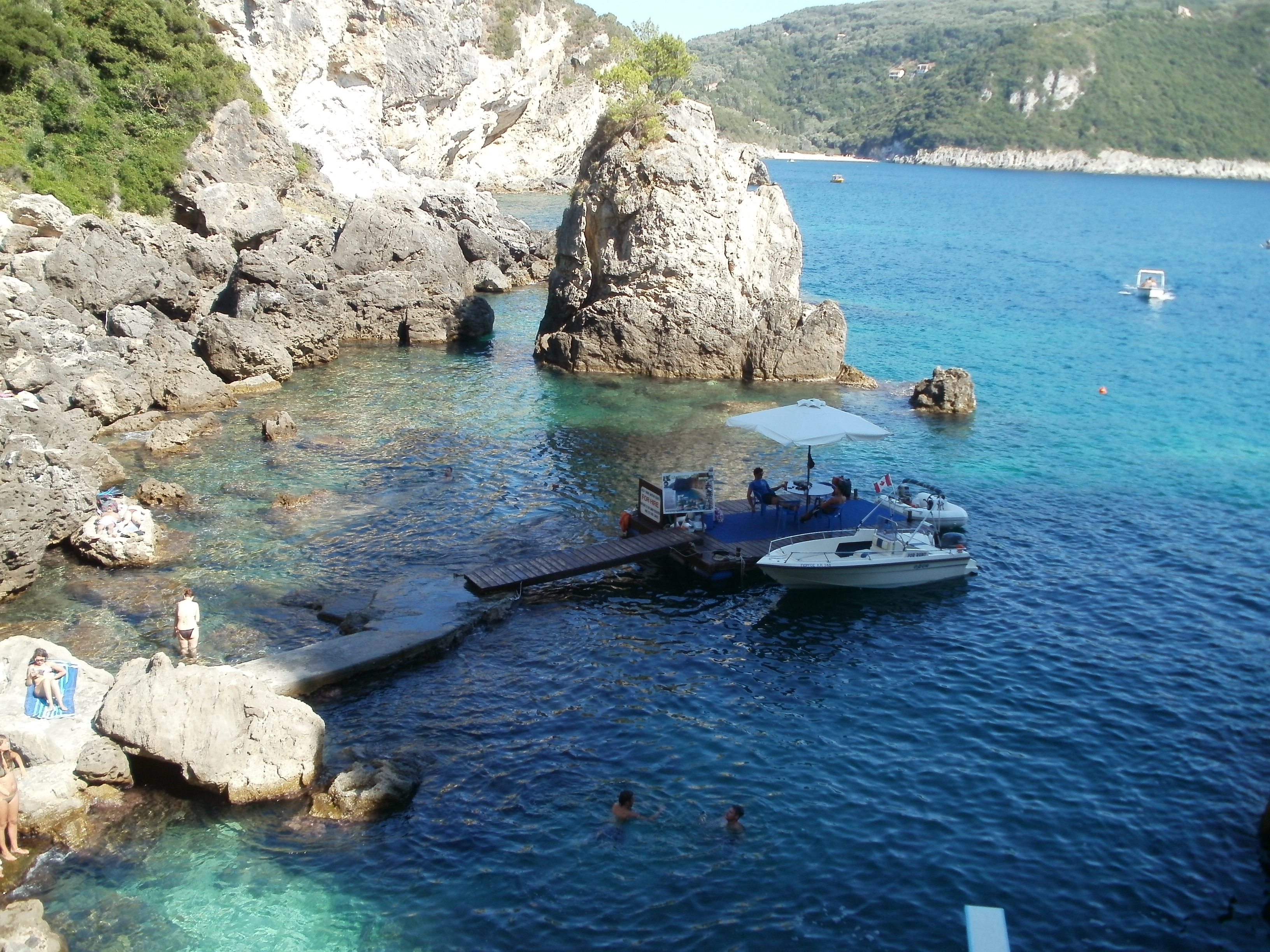 Description: A boat is docked at a rocky shore with people swimming in the water and on the rocks and in the water.