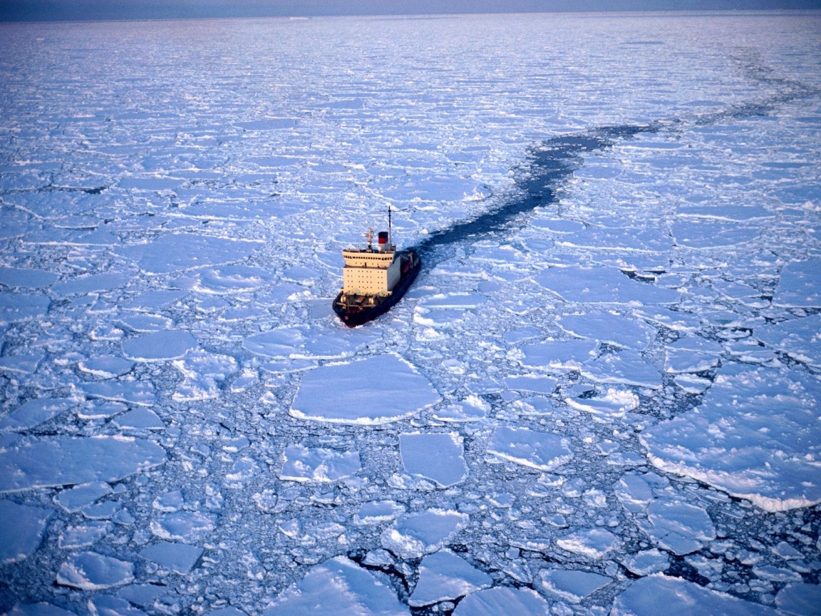 Description: A boat is floating on the ice in the ocean water with ice floes around it and a long trail of water behind it.
