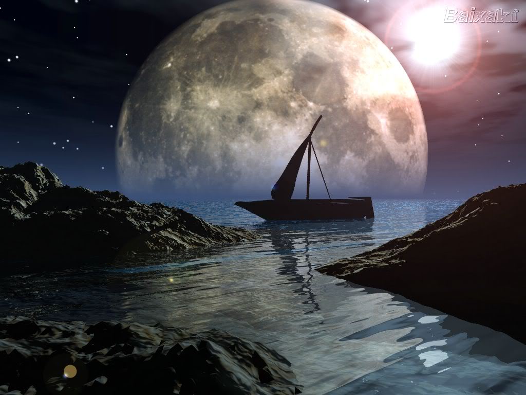 Description: A boat floating on top of a body of water under a full moon sky with a full moon in the background.