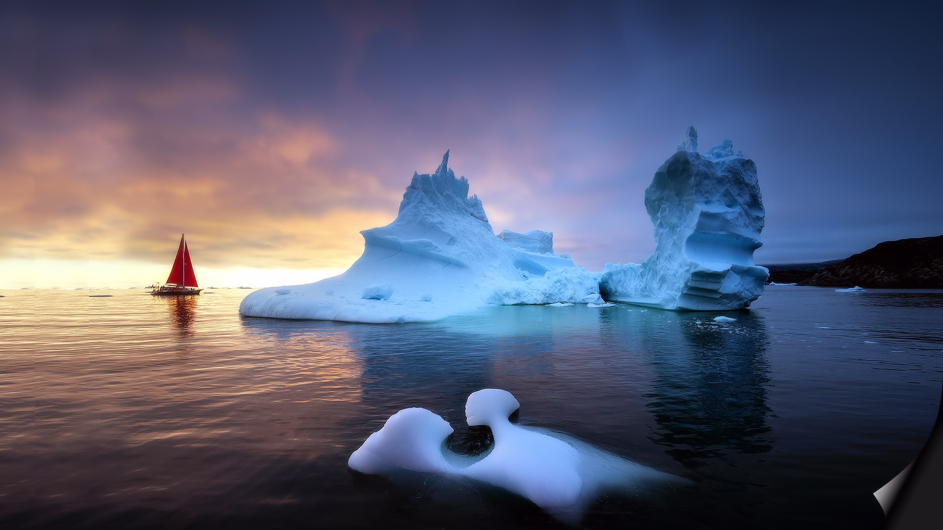 Description: A boat is in the water near icebergs and a red sailboat in the distance with a cloudy sky.