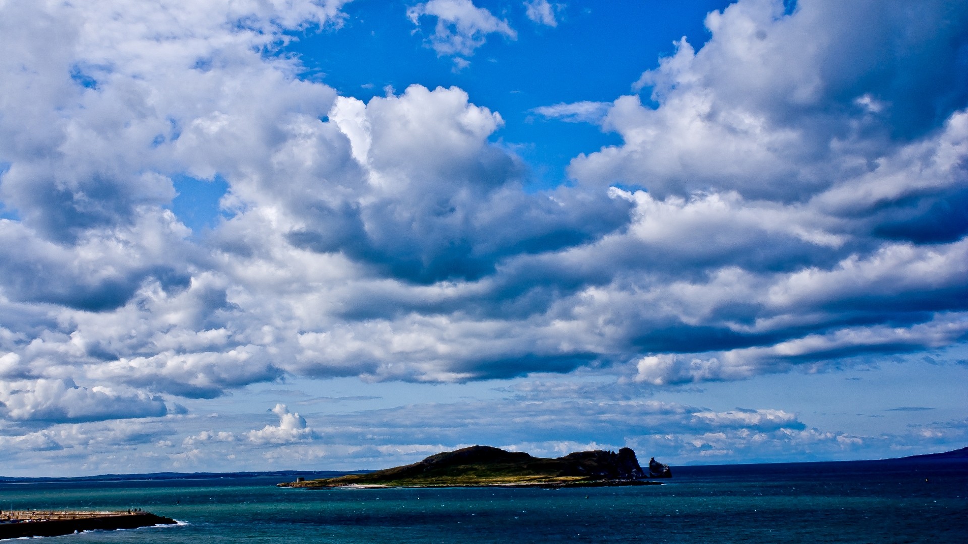 Description: A boat is out on the water under a cloudy sky with a small island in the distance in the foreground.