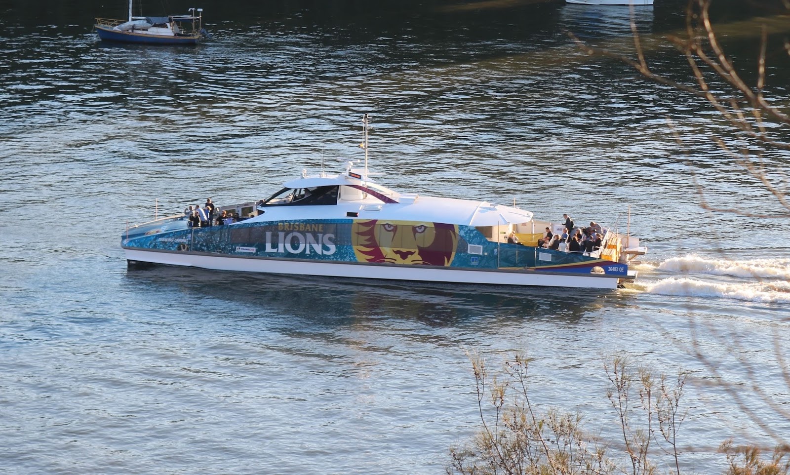 Description: A boat with lions painted on it is in the water near a shore line with boats in the background.