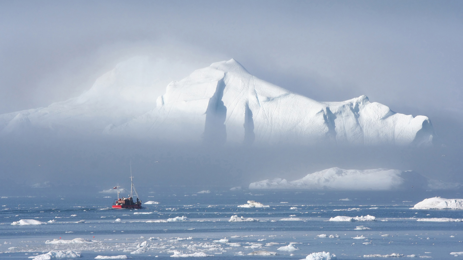 Description: A boat in the water near a large mountain covered in snow and icebergs in the distance.
