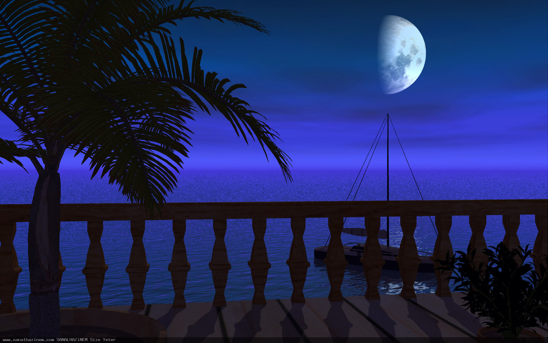 Description: A boat is sitting on the water at night with a full moon in the background and a palm tree in the foreground.