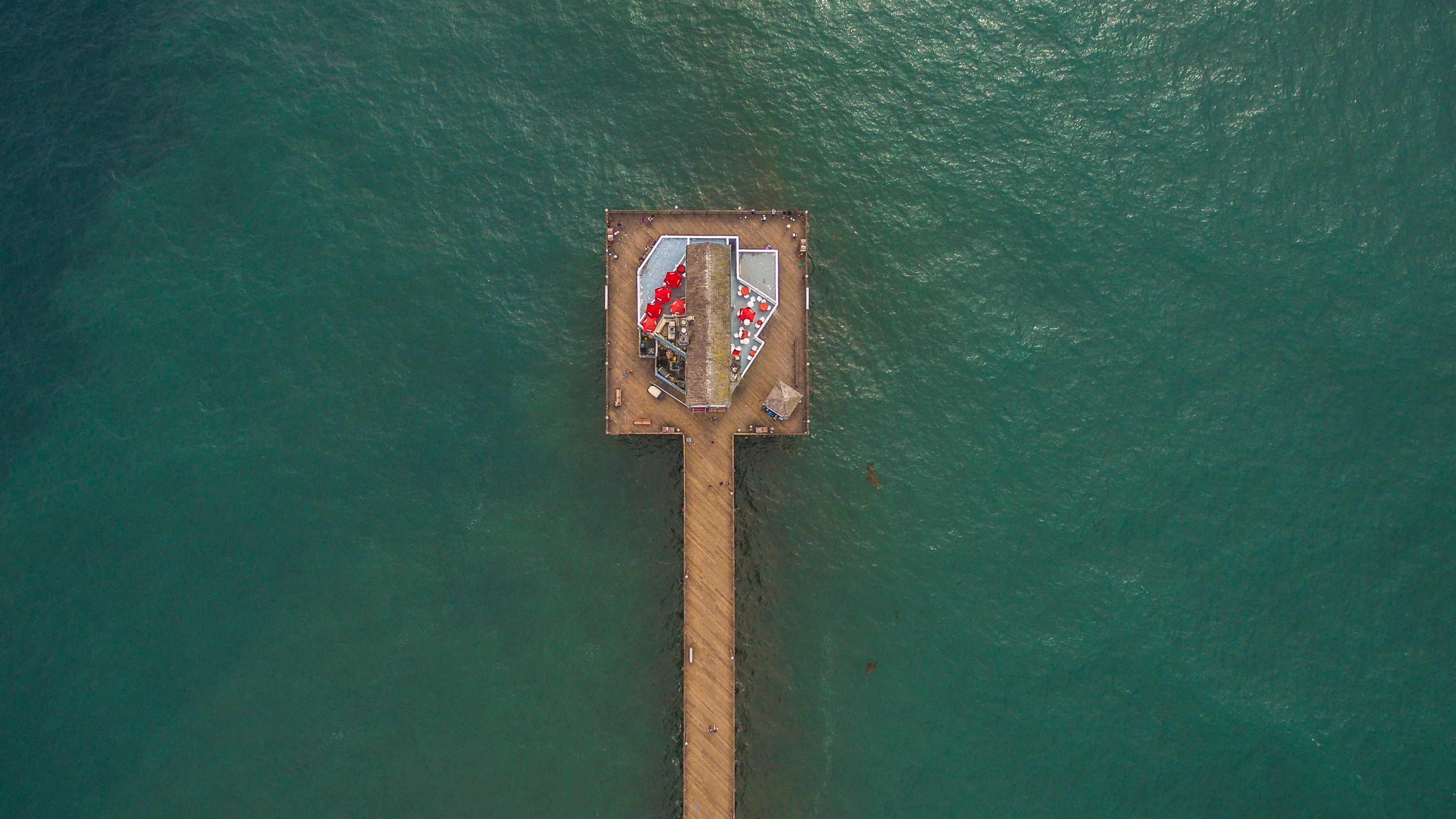 Description: A boat is floating in the water near a pier with a red umbrella on it's side and a man standing on the deck.