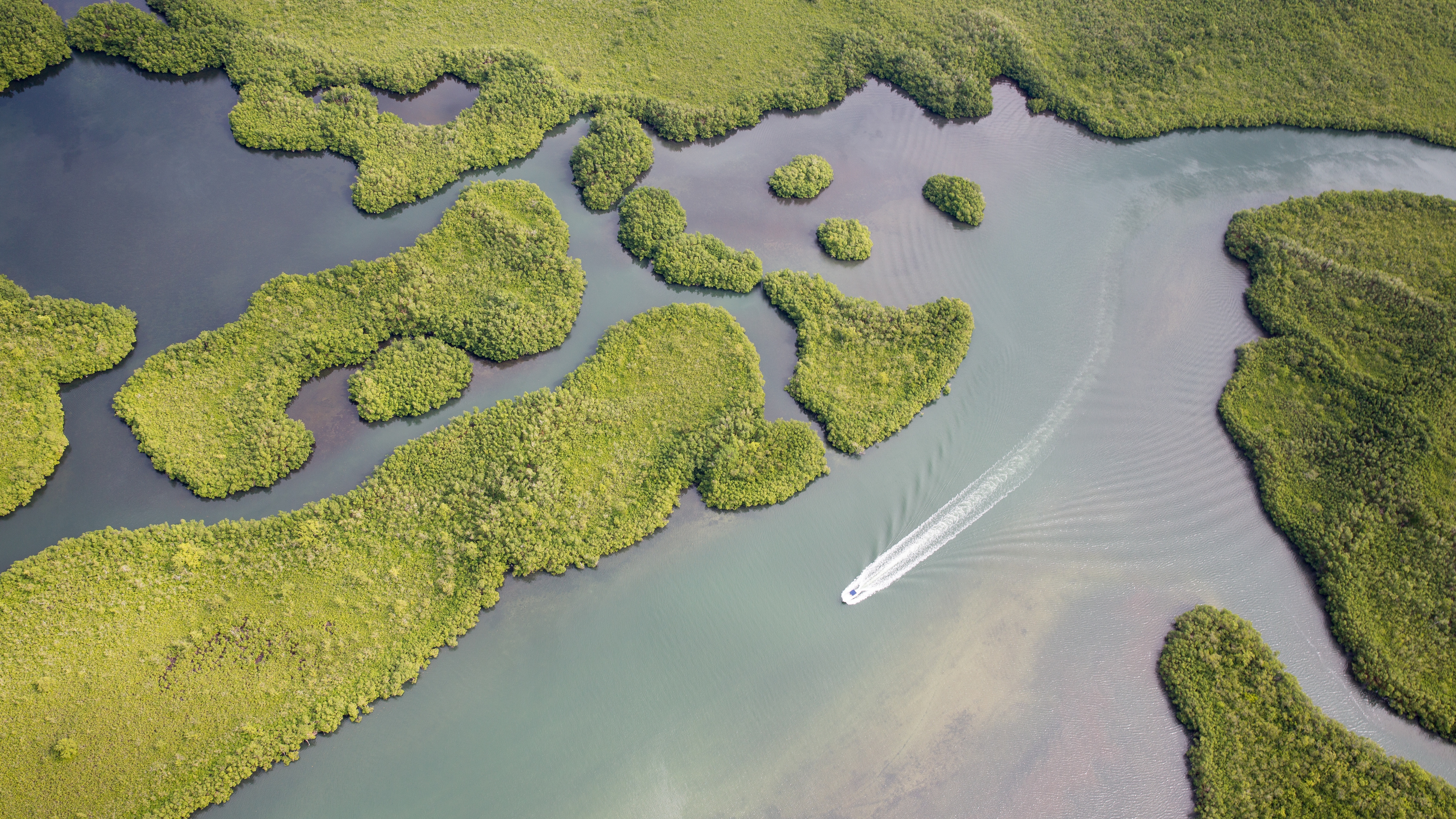 Description: A boat is in the middle of a river surrounded by green land and trees.