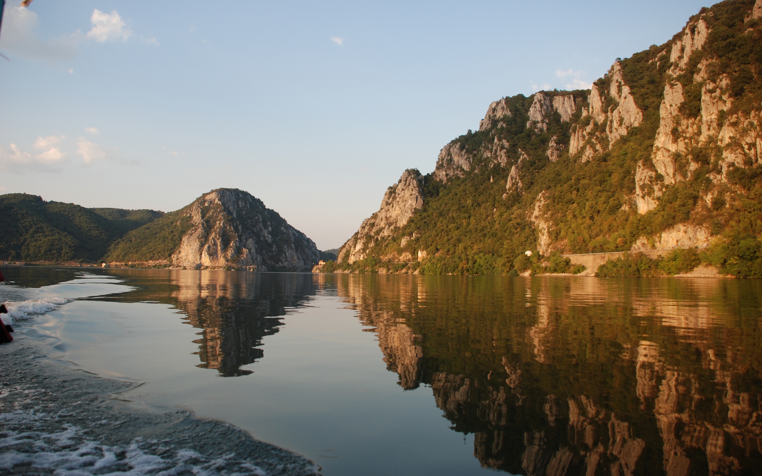 Description: A boat traveling down a river next to a mountain range with a lake below it and a person on a boat.