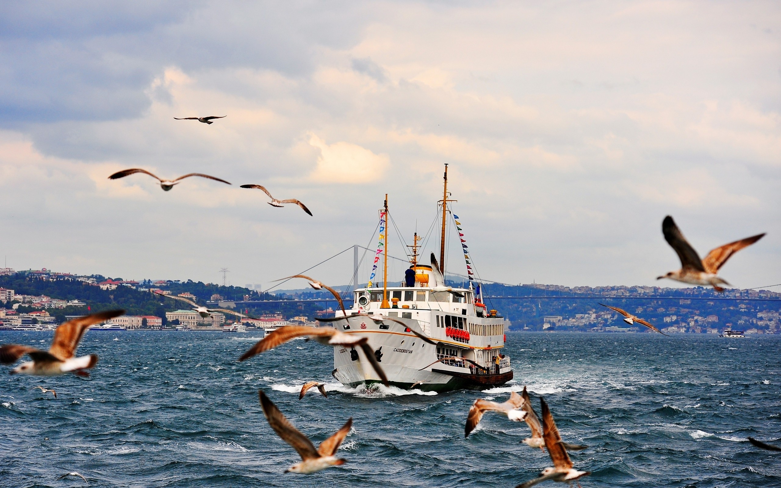 Description: A boat in the water with seagulls flying around it and a city in the background with a few buildings.