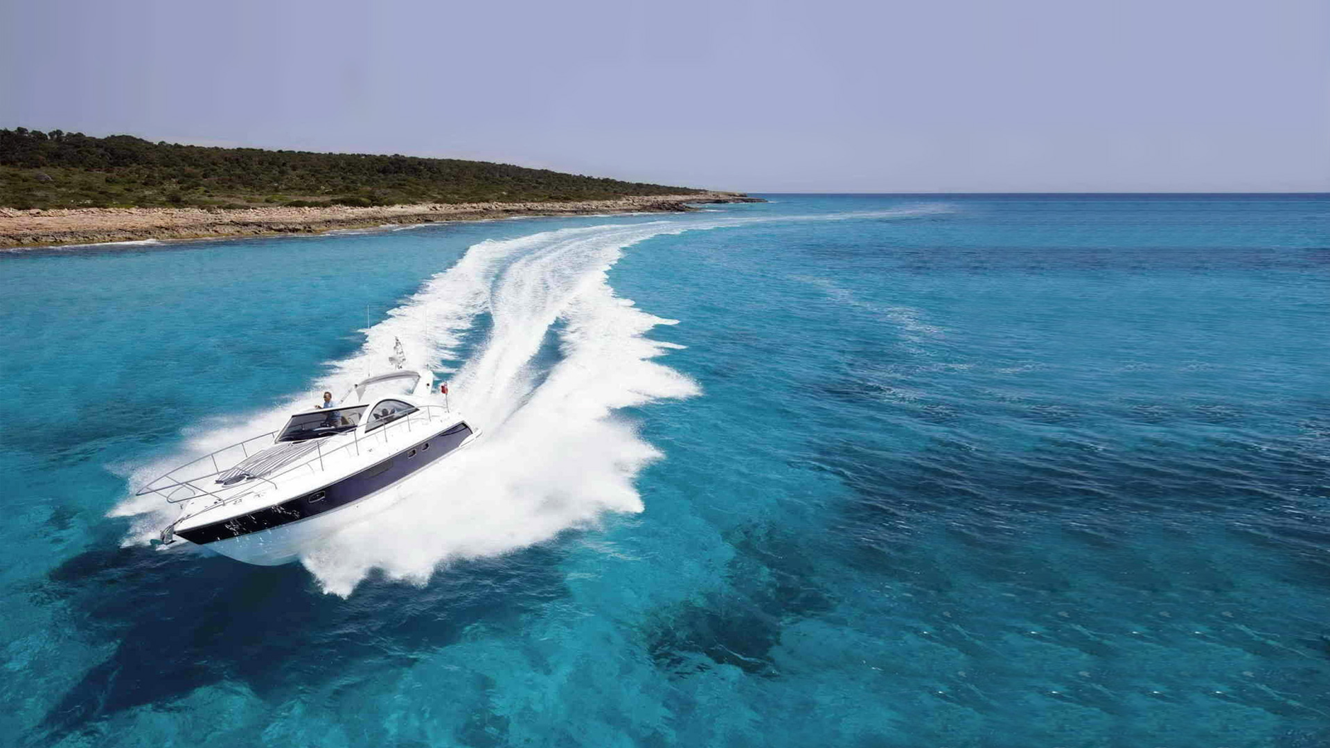 Description: A boat is traveling through the water near a shore line with a small island in the background and a blue sky.