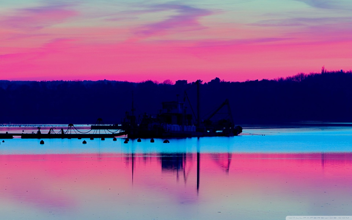 Description: A boat is sitting in the water at sunset or dawn with a pink and blue sky in the background.