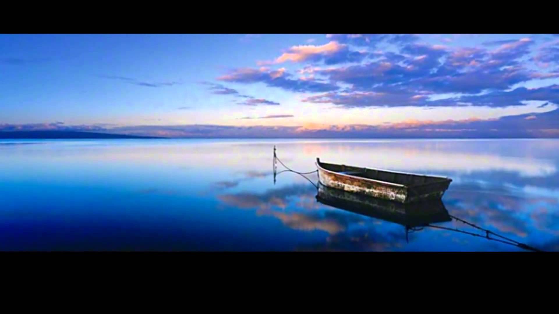 Description: A boat is sitting on the water at sunset or dawn with a blue sky and clouds reflected in the water.