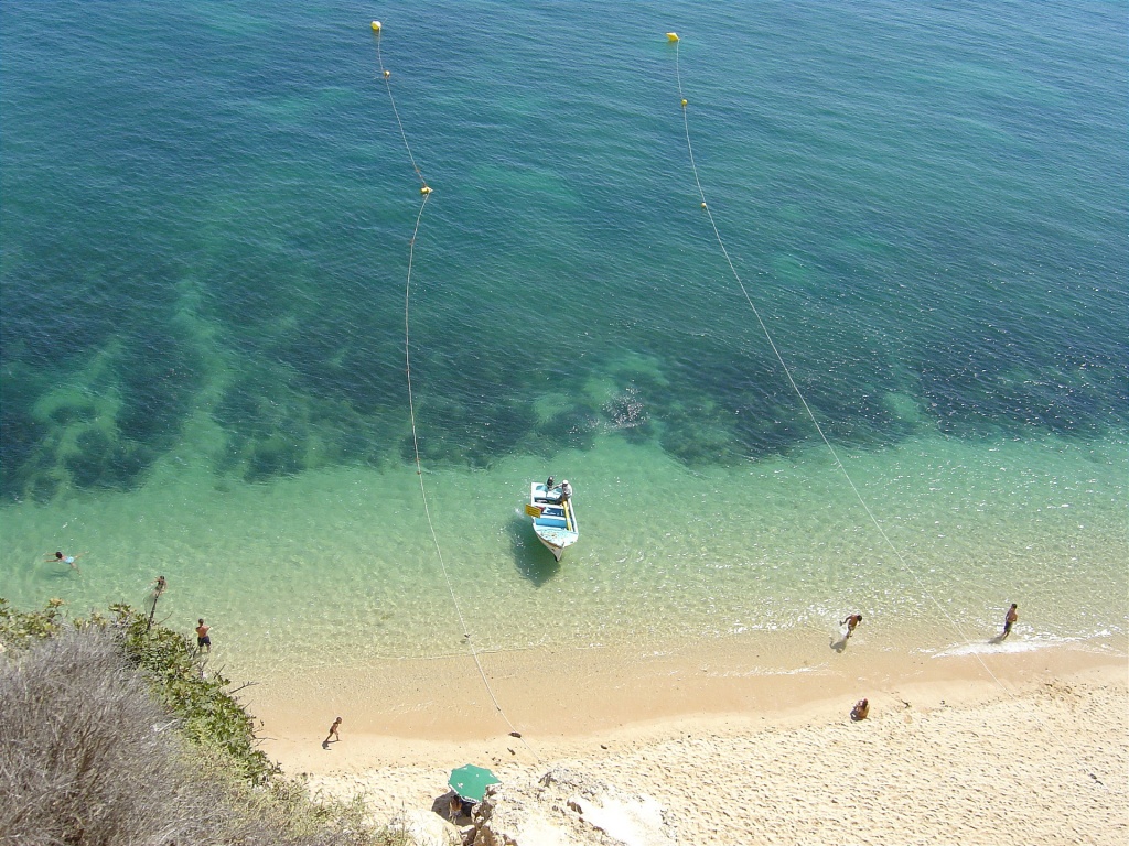 Description: A boat is tied to a rope on the beach with people in the water nearby and a man in the water.