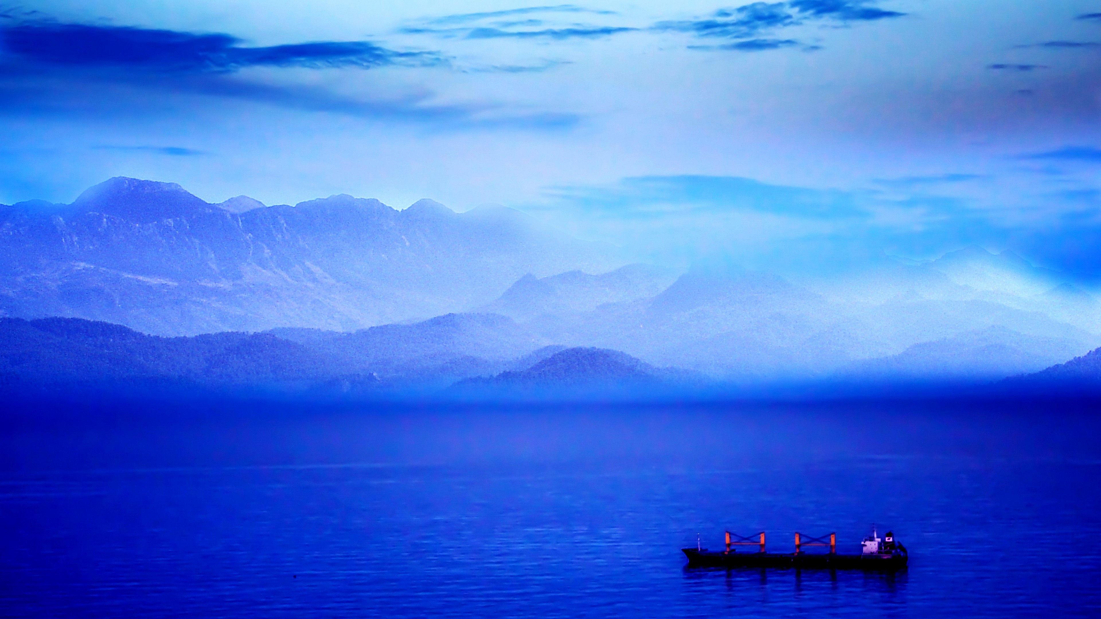 Description: A boat floating on top of a large body of water under a cloudy sky with mountains in the background.
