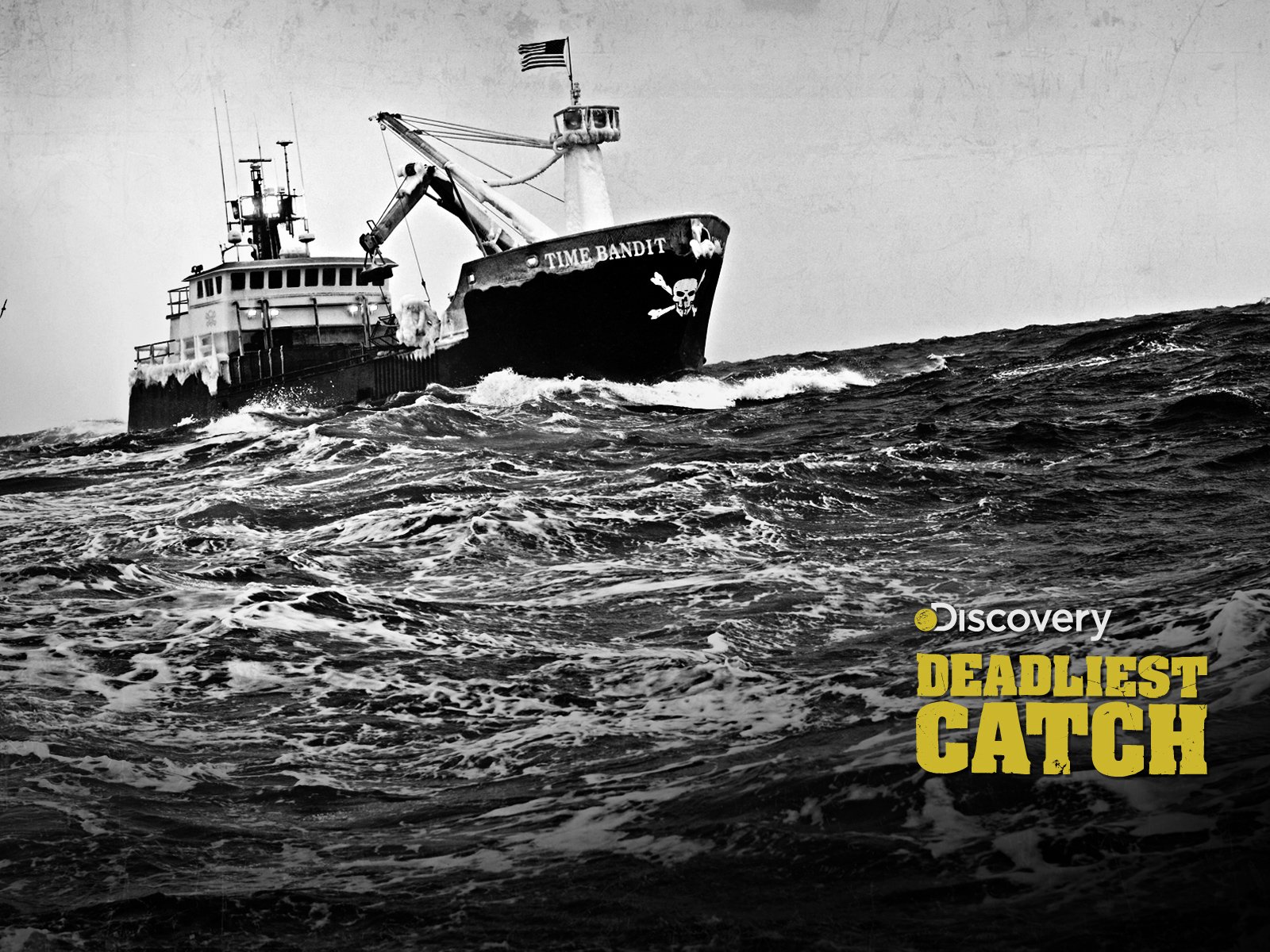 Description: A boat in the middle of a large body of water with a caption that reads discovery deadest catch.